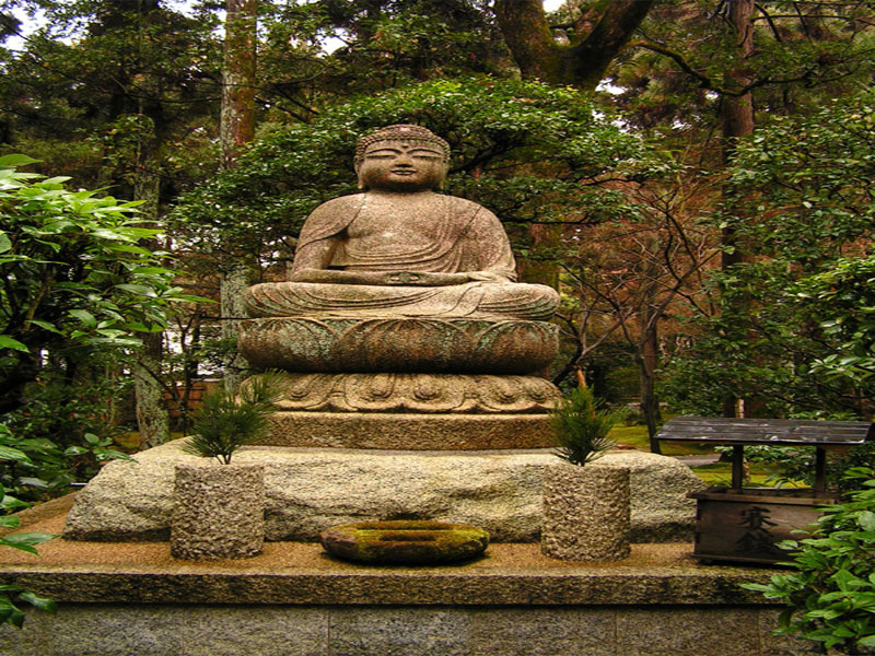 Theo lối ra để rời khỏi Kinkakuji, ở ngay một khúc quanh, nhiều du khách dừng lại bên một tượng Phật đá đặt trong góc vườn. Có hai ống tre nhỏ và vài chiếc bát được đặt trước tượng. Vài người đứng xem (có lẽ vì tò mò) và vài người đang cố gắng ném được một đồng 5 yen (được xem là đồng tiền may mắn) vào trong ống tre hay chiếc bát. Người Nhật tin rằng ai ném trúng vào đó thì phúc lộc sẽ tuôn về tràn trề.